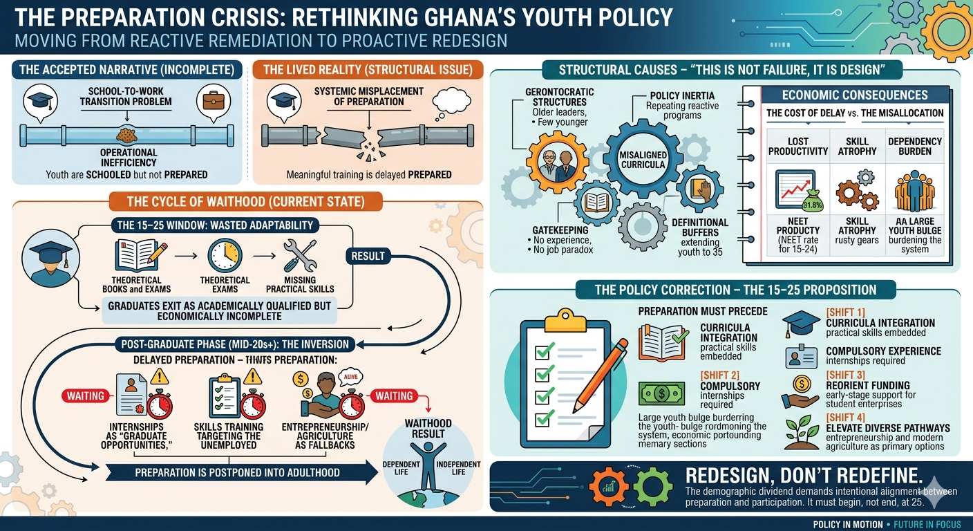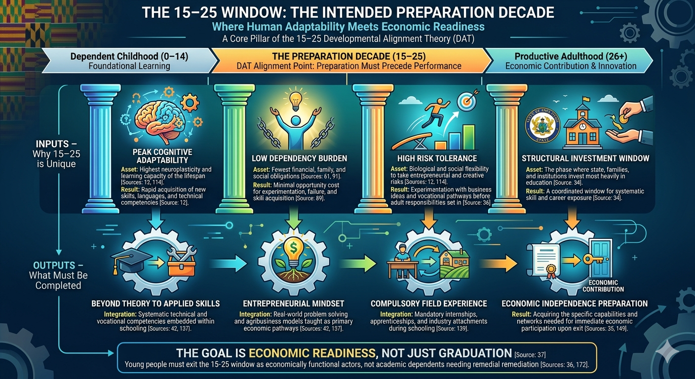 The policy correction required is both straightforward in concept and transformative in potential impact: Ghana must intentionally redesign its education and youth development systems so that the 15-25 window becomes a genuine, complete preparation phase-where strong academic foundations are deliberately combined with mandatory practical readiness rather than continuing to defer meaningful preparation for economic participation until adulthood.
